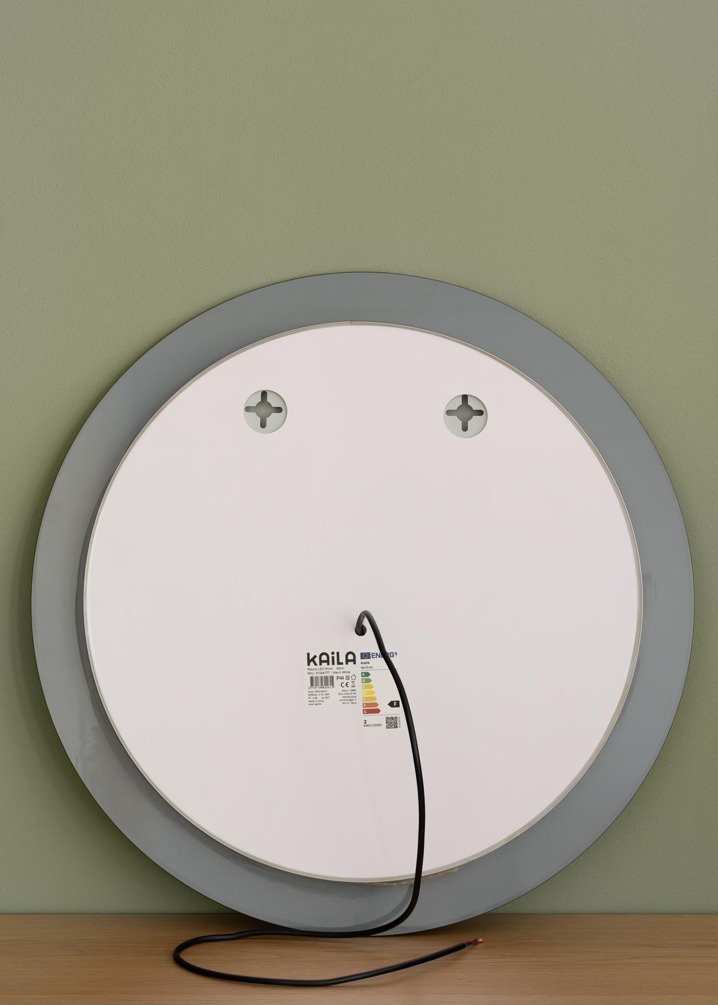 Voici un miroir de salle de bain classique de forme ronde par le suédois KAILA. Le miroir de salle de bain est doté d'un éclairage LED à intensité variable intégré sur son pourtour et qui projette une lumière vers l'arrière, ce qui projette une belle lueur blanche chaude vers l'avant en 3000K. L'éclairage peut s'atténuer, vous pouvez facilement régler la puissance de la luminosité en maintenant le bouton enfoncé pendant quelques secondes. La LED est une source de lumière écoénergétique qui fournit une lumière uniforme et naturelle.