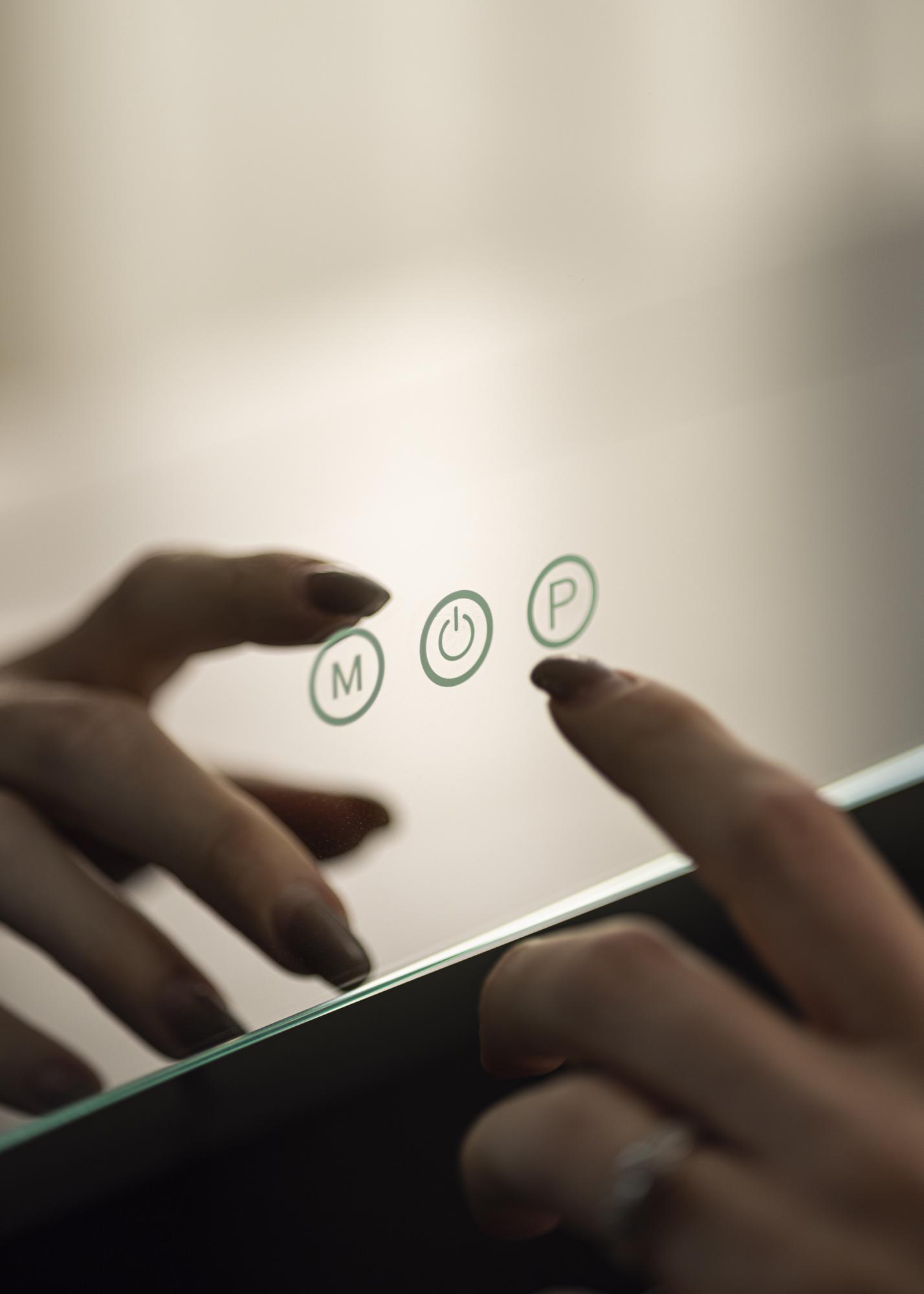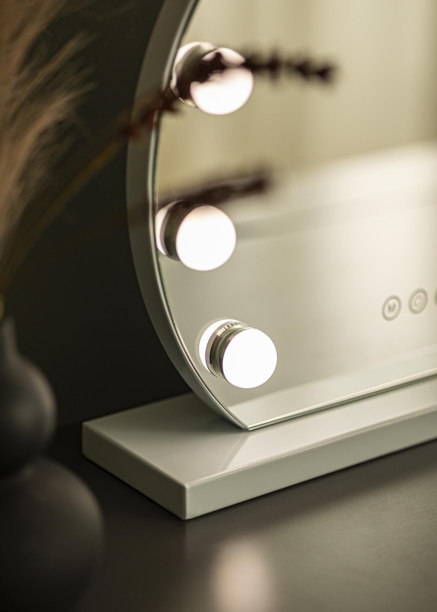 Voici un luxueux miroir à maquillage avec éclairage LED incrusté qui procure une lumière uniforme sur votre visage lorsque vous vous reflétez. L'éclairage comprend 10 LED qui sont positionnées sur le pourtour de sa surface réfléchissante. La lumière peut être ajustée selon vos goûts et vos envies, car vous avez la possibilité de régler à la fois la luminosité et la température de couleur. Les réglages de l'éclairage se font via les boutons tactiles sur le bord inférieur du miroir marqués par des lettres. Via le bouton marqué d'un "M", vous pouvez choisir la température de couleur entre lumière chaude, froide et naturelle. Le bouton marqué "P" est utilisé pour atténuer la lumière. Il y a aussi un bouton marche/arrêt qui sert à allumer ou éteindre l'éclairage. Le raccordement électrique s'effectue avec une prise.