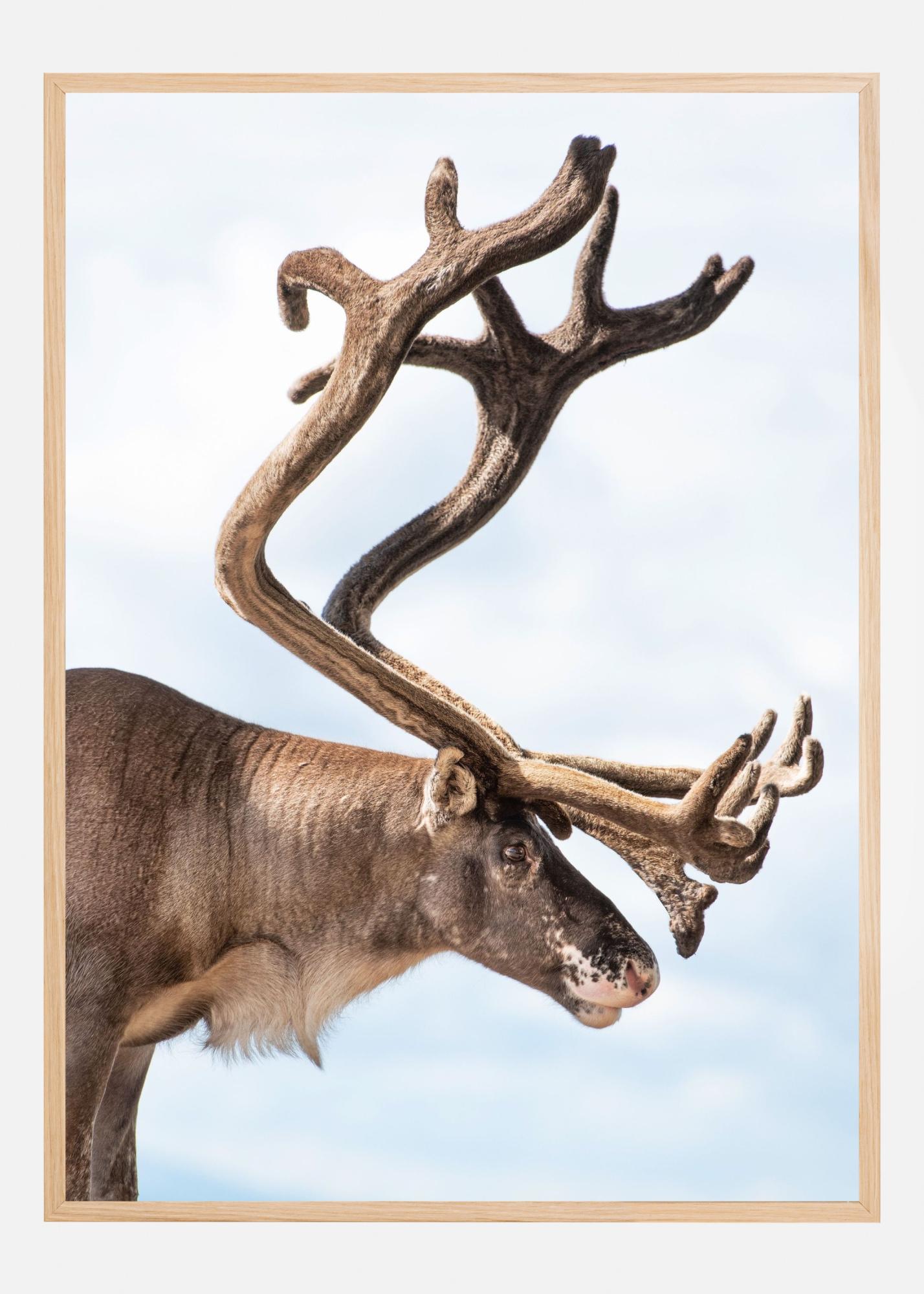 La palette de couleurs de cette impression est harmonieuse et naturelle, avec des nuances de brun, brun foncé, beige et blanc crème dans la fourrure et les bois du renne, associées à un fond clair en Blanc et bleu clair doux. Ces teintes naturelles permettent d’associer facilement l’affiche à différents styles d’intérieur. Elle fonctionne aussi bien seule qu’en combinaison avec d’autres posters dans un mur de cadres.